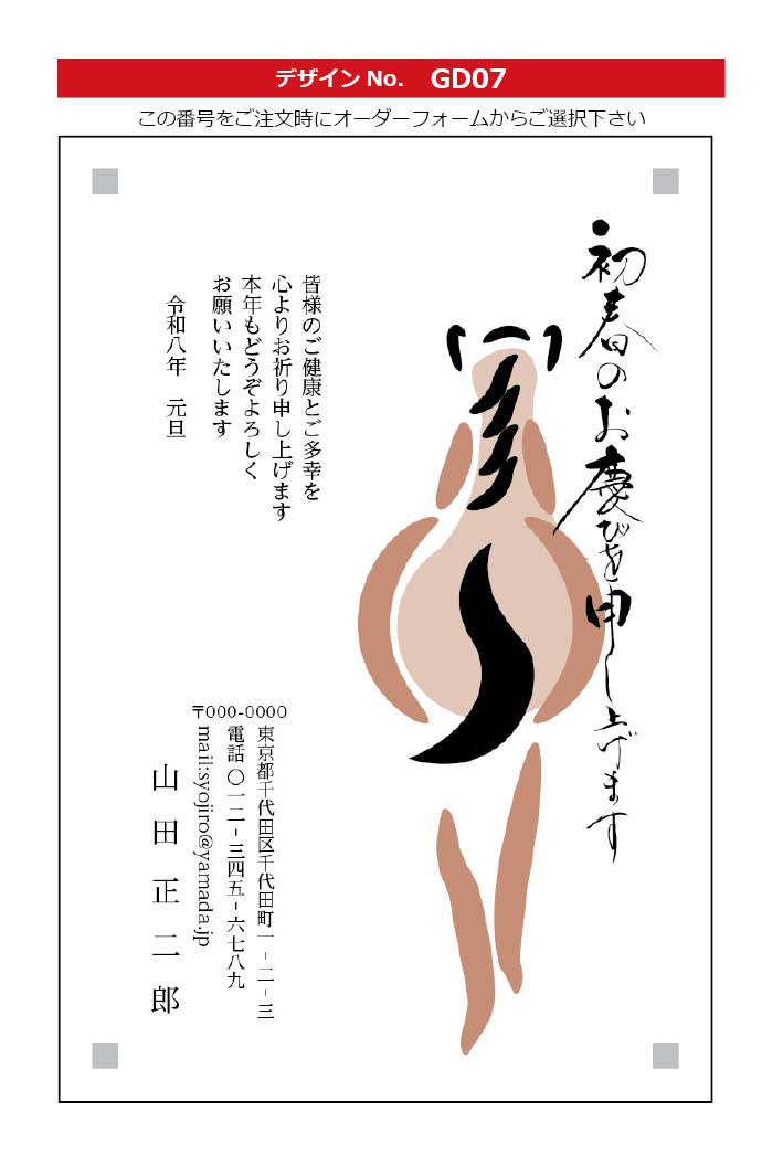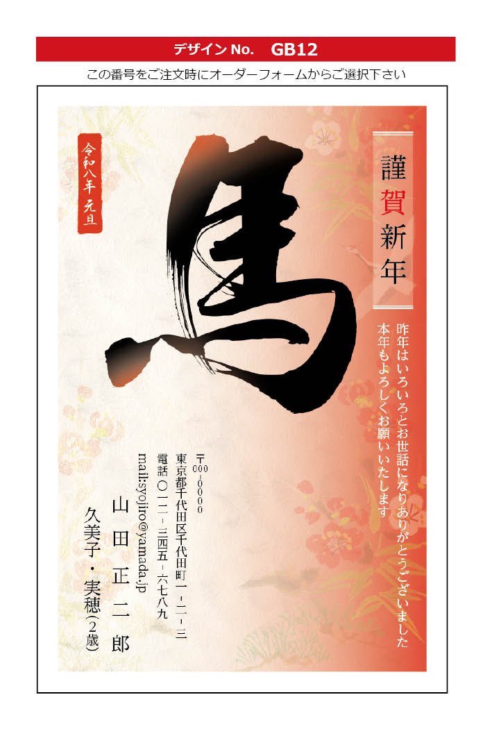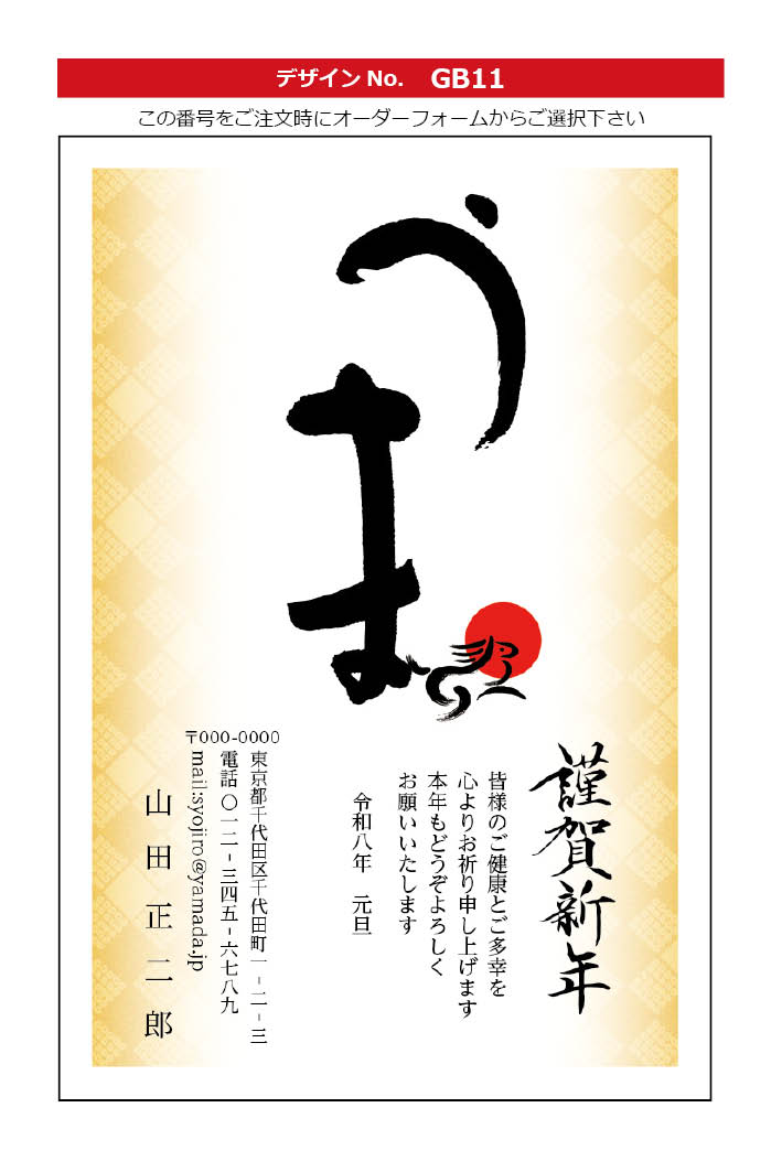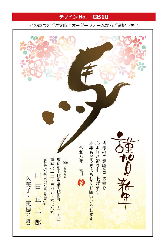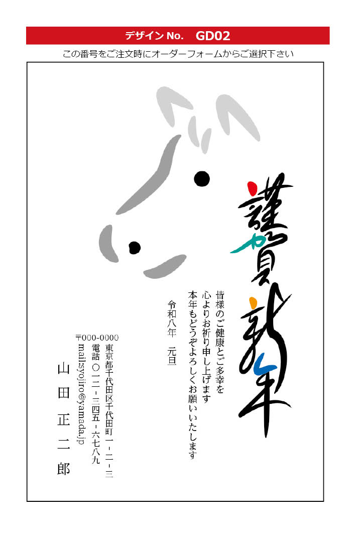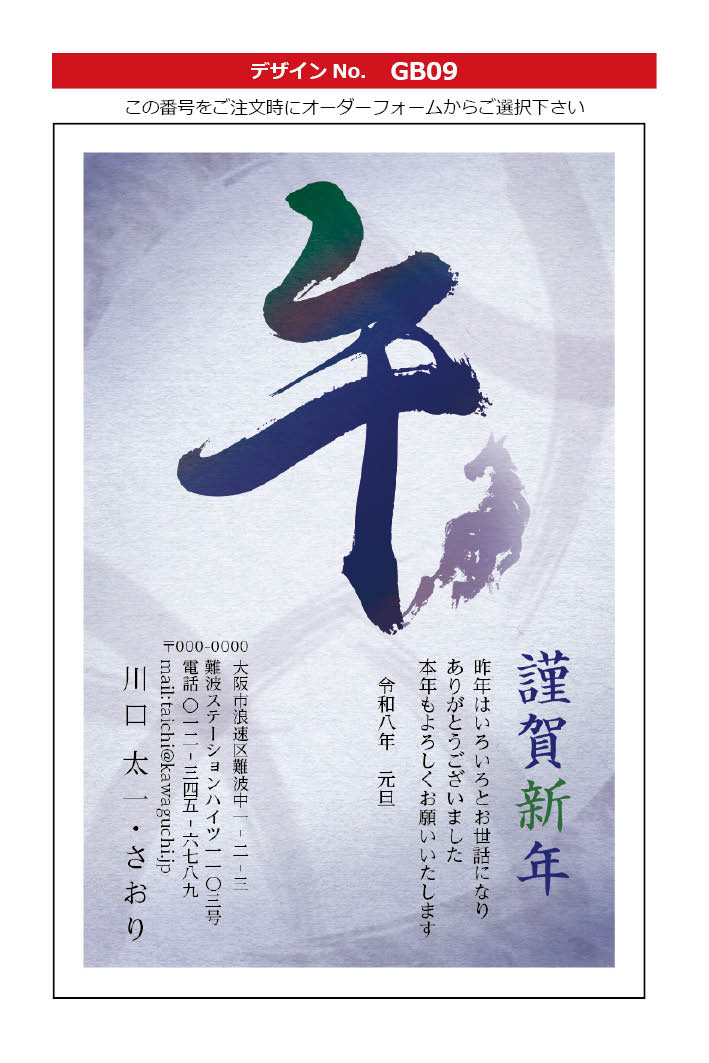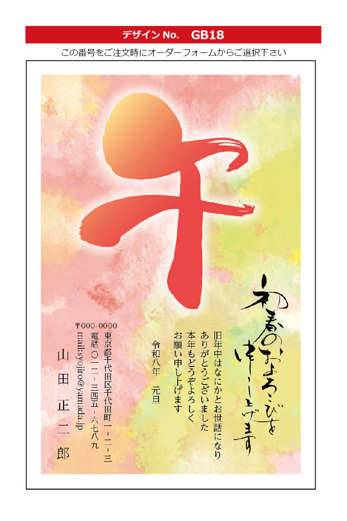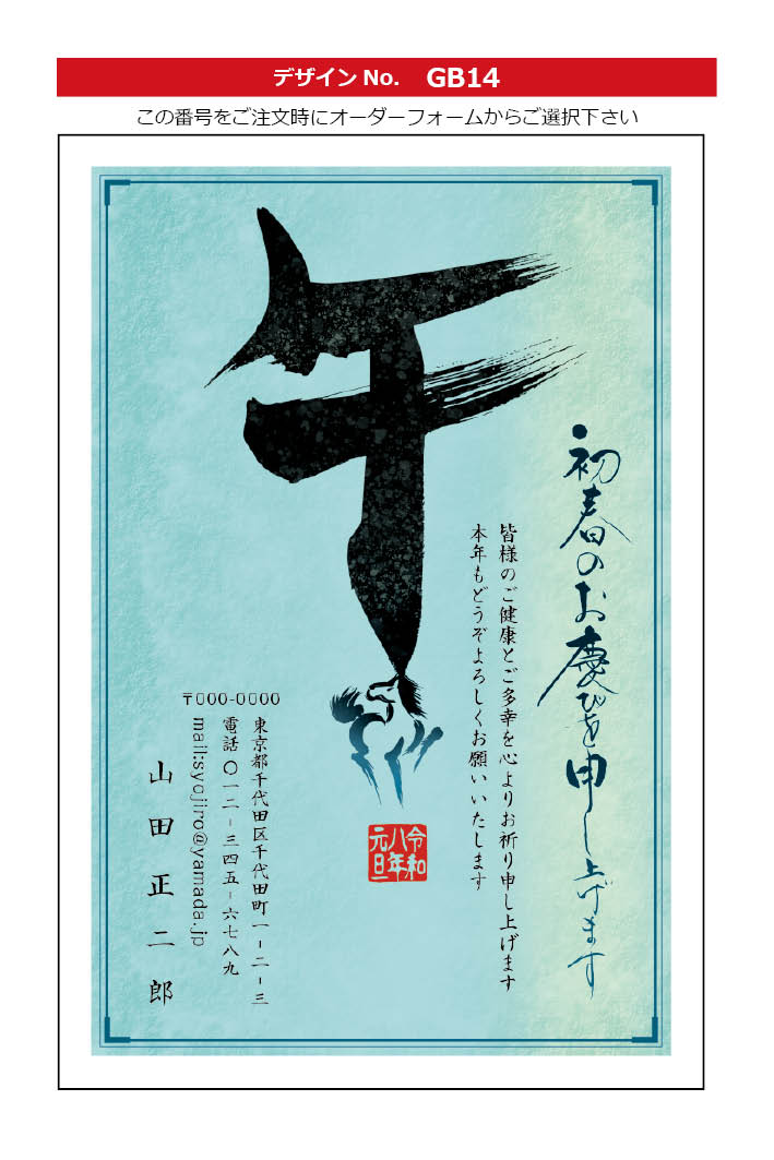 筆文字(GB) スタンダード(GS) デザイナーズ(GD) 縁起物(GE) 絵文字(GA) 絵手紙風(GT) 和風(GW) 会社向け(GO) モノクローム(GM) カジュアル(GC) キュート(GQ) 立体キャラクター(GP) 写真フレーム(GF) 喪中はがき(GZ) 寒中お見舞い(GZ)